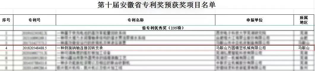 8月29日,安徽省市場監(jiān)督管理局(知識產(chǎn)權局)發(fā)布了《第十屆安徽省專利獎評選公示》(公示期為七個工作日),擬對在2022年度申報的優(yōu)秀專利獎項目進行推薦及表揚。經(jīng)過公示,馬鞍山方圓精密機械有限公司憑借“一種側(cè)面銷軸連接回轉(zhuǎn)支承”專利,獲得安徽省專利優(yōu)秀獎。